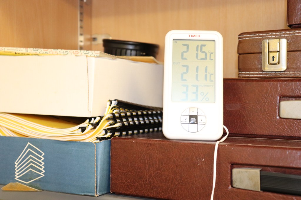 The first batch of wax cylinders was put in the fridge, keeping them cool on 10°C. Luckily there was no staff in the Music Department on the day, as they would be very surprised to see a batch of cylinders in the community fridge, instead of food. Duncan measured each cylinder’s temperature using thermochromic strips throughout the session. The second batch was put in the room, so they adapt to the room temperature (21.5°C). The third batch was put in the portable incubator which kept them all on 30°C.