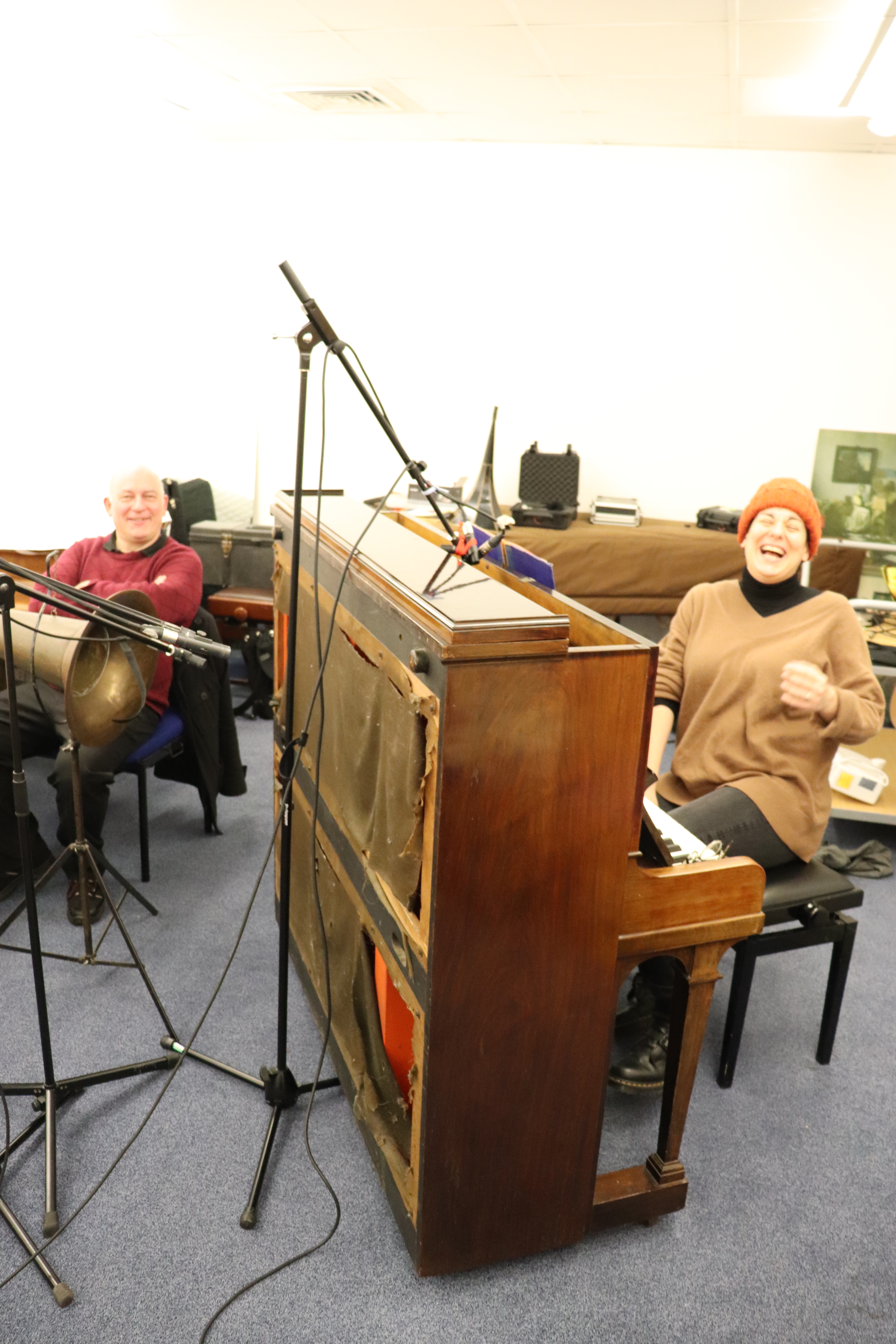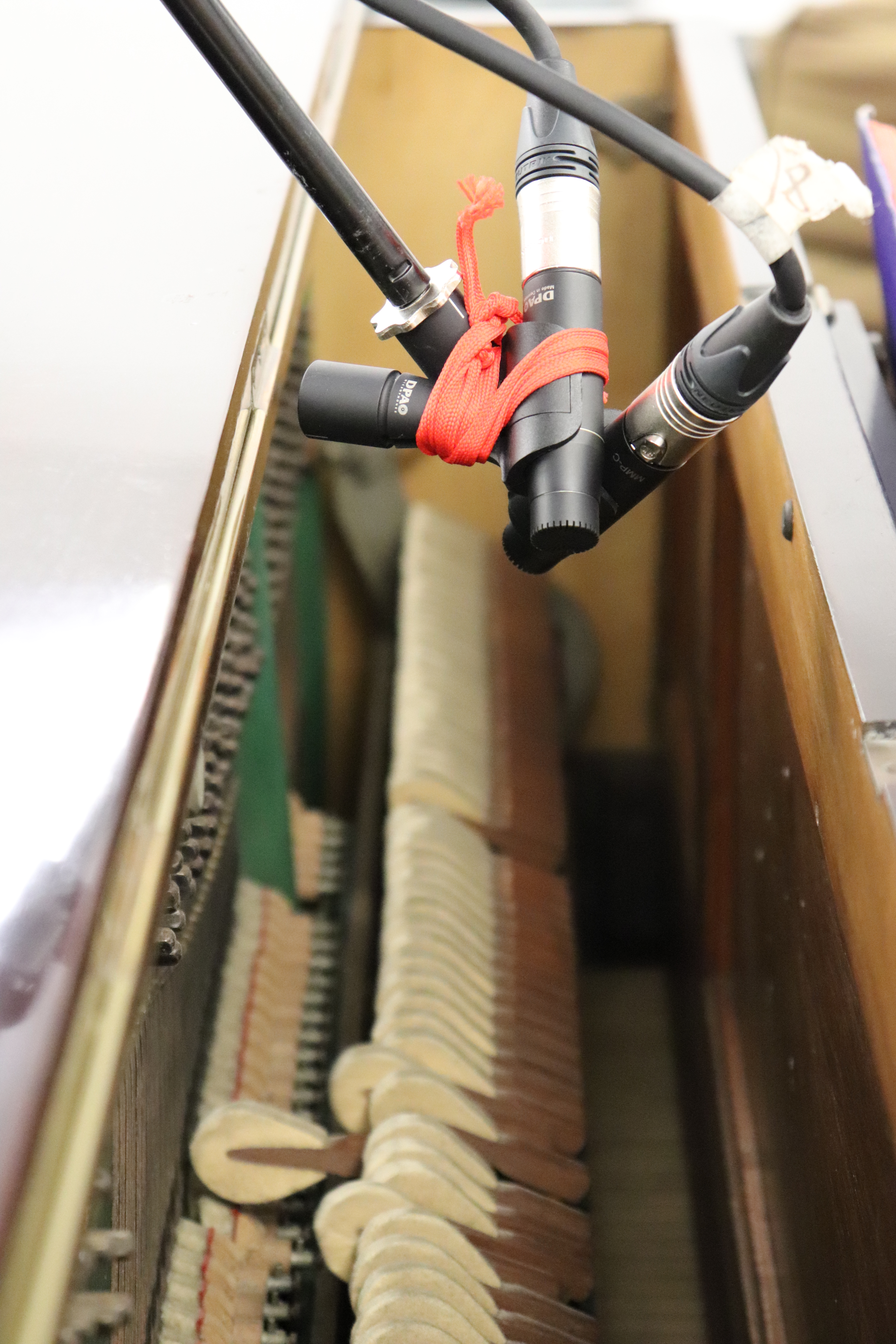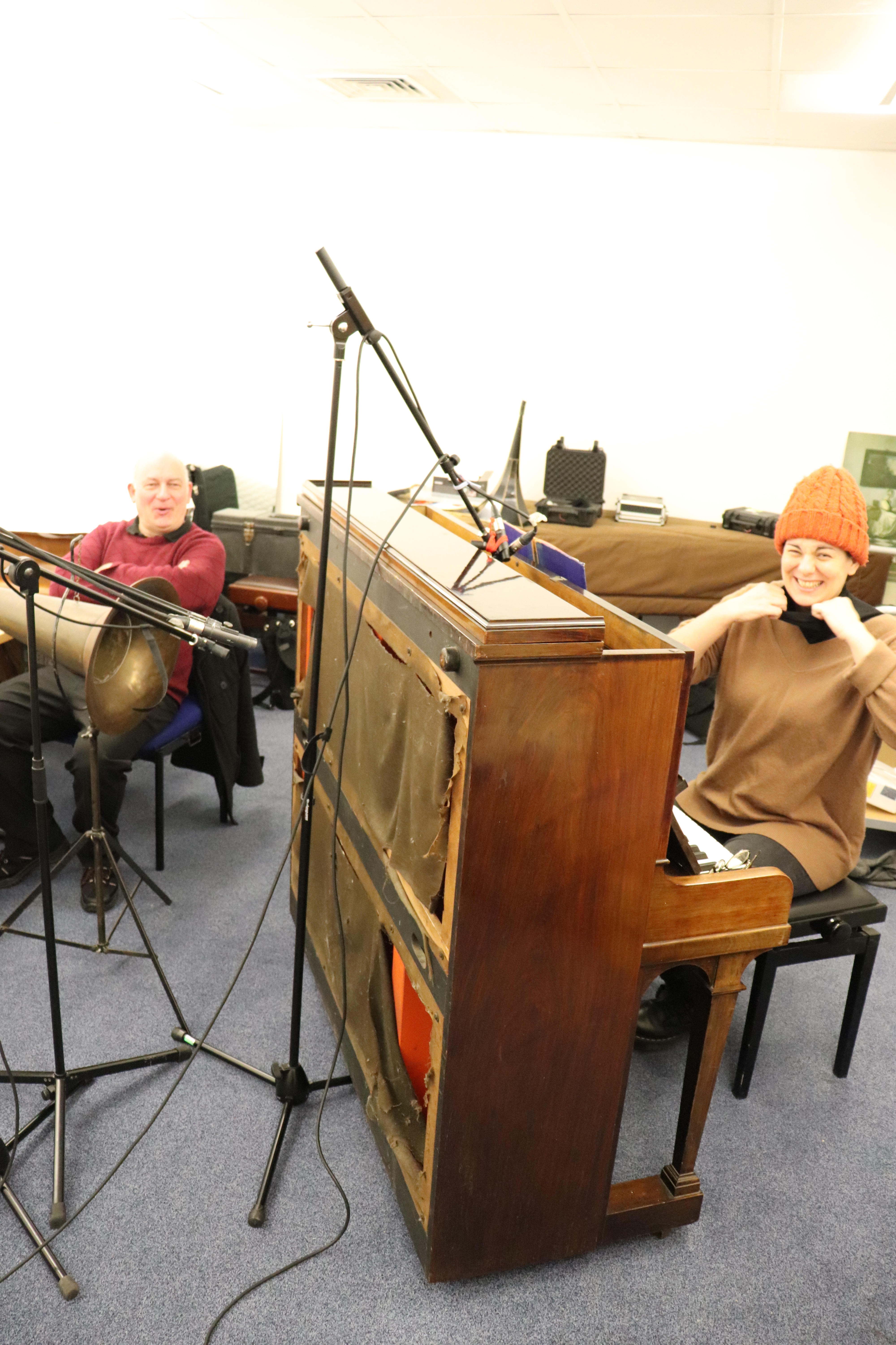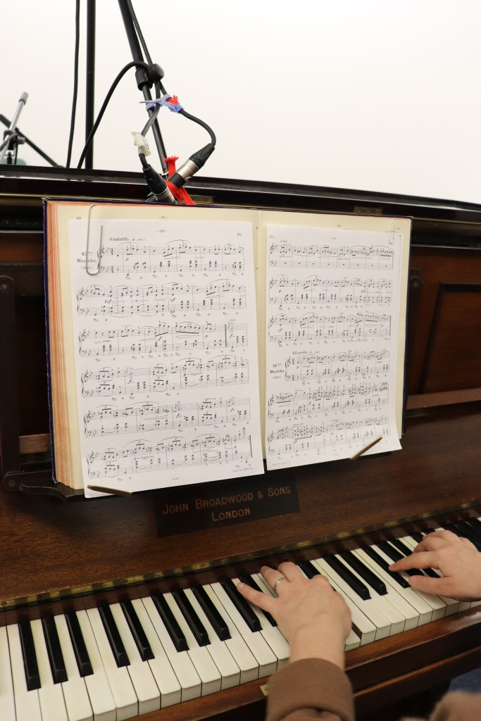 Using the upright Broadwood really made a difference, even though it wasn’t as loud as the grand pianos we used previously. It was much easier to set both mechanical and digital equipment up. From the pianist’s perspective, I was very happy not being able to see any of the equipment around me – as it was all facing the back of the piano. The only small problem was to peep over the piano, waiting for Duncan to give me a sign to start playing – as in mechanical recording sessions it is that way around, which I had to get used to. The piano recorded perfectly, and its slightly brassy sound registered wonderfully to cylinders, with an occasional high pitched tone poking through.
