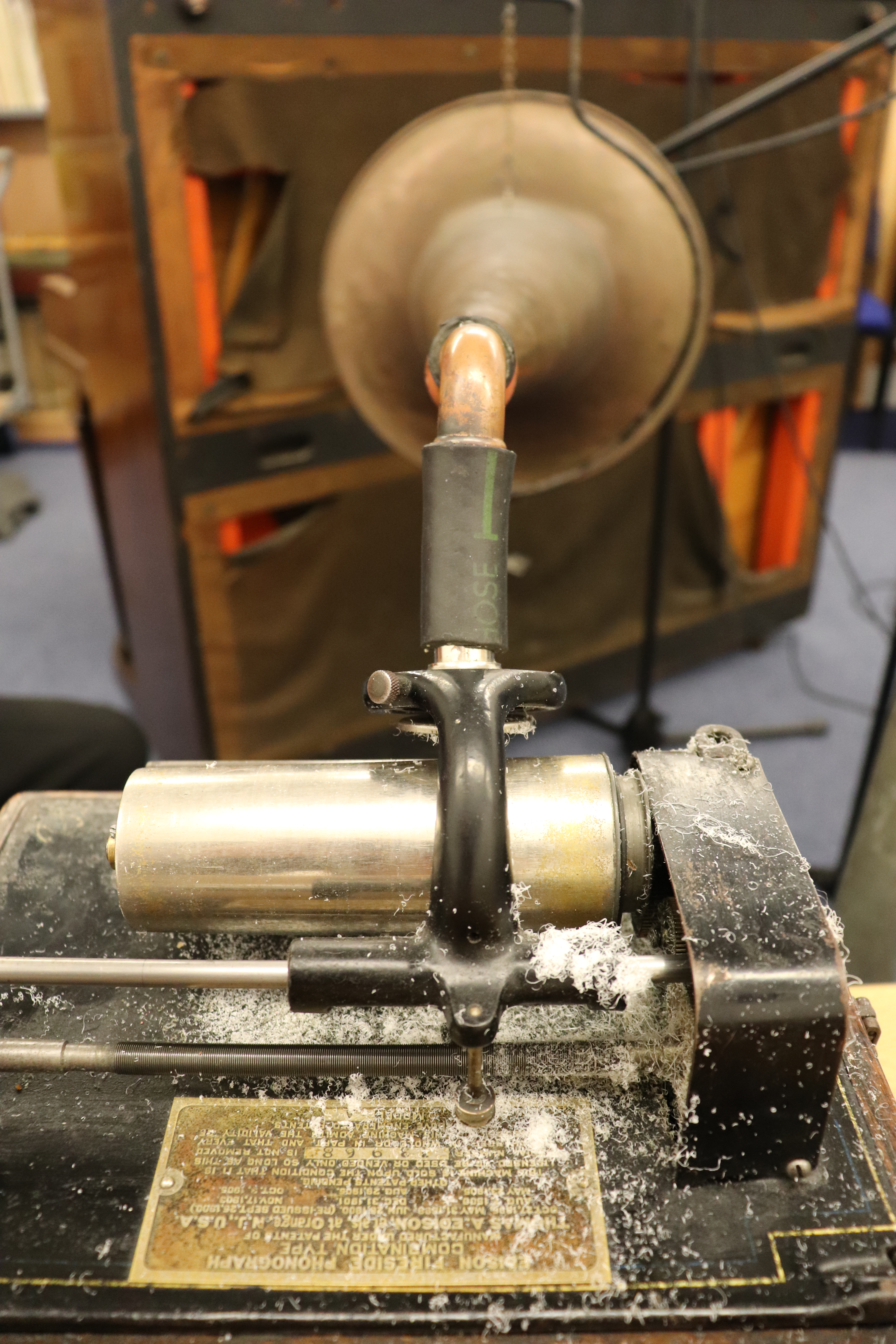 Mechanical equipment: Edison Fireside – model B; Edison New recorder (1901) – glass diagram; brass flared horn (762mm by 355mm)