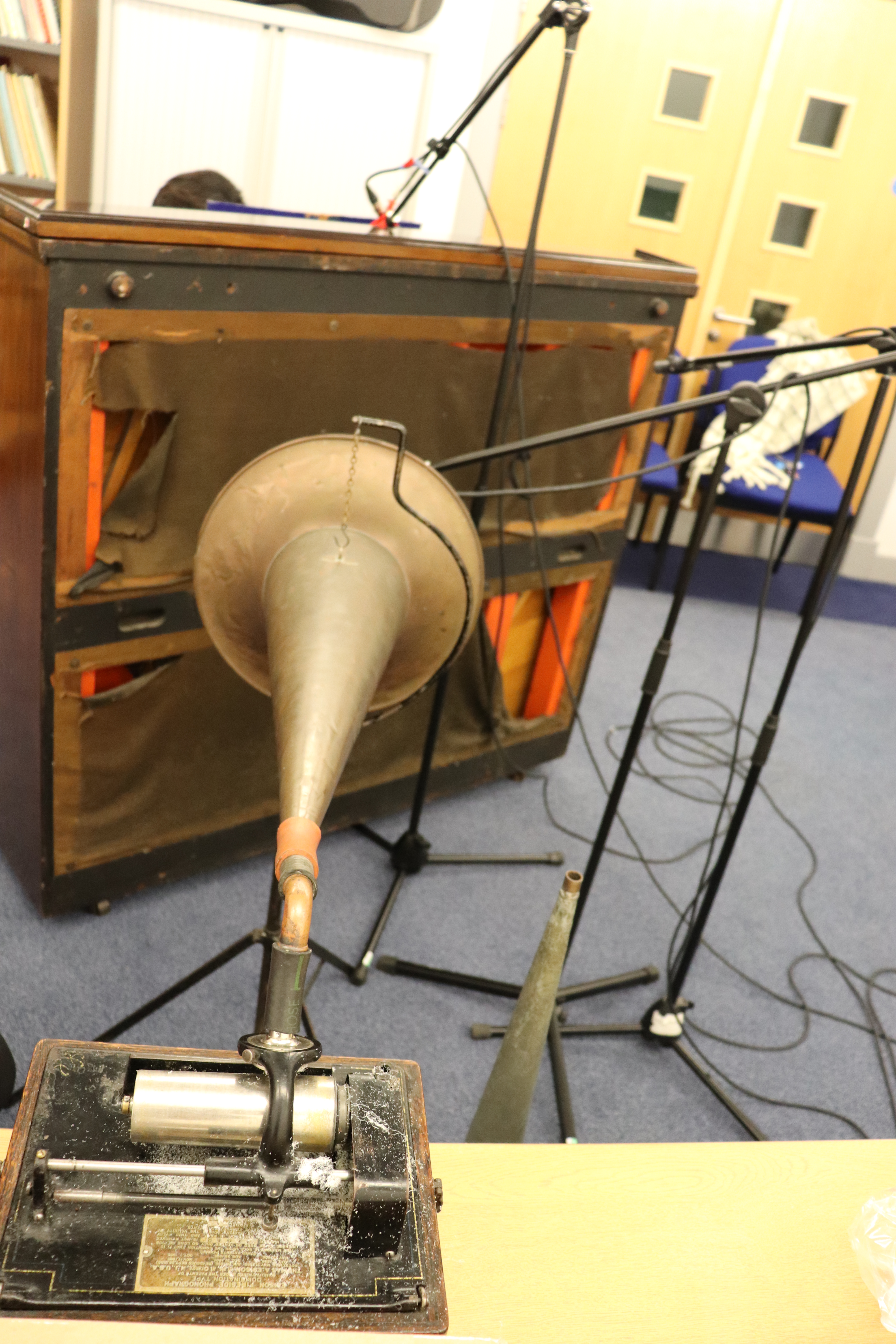 I will not go into details of recording process here, because it was very similar to Recording session 1, described here. We used the knowledge and experience gained from the previous sessions, and decided that we will use Edison Fireside (Model B) with Edison New recorder (1901) with a glass diagram. After some initial testing, we chose the brass flared horn (762mm by 355mm) because it gave the clearest results.